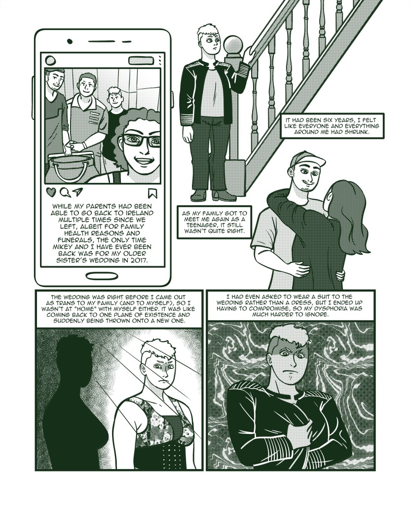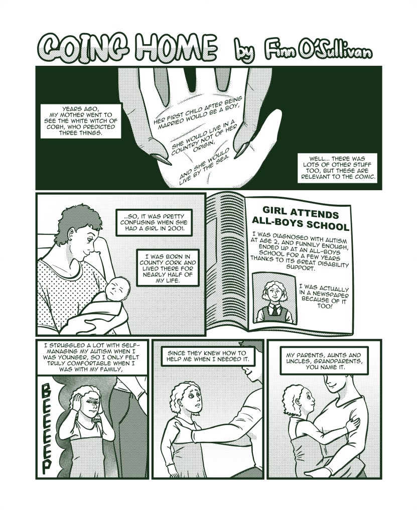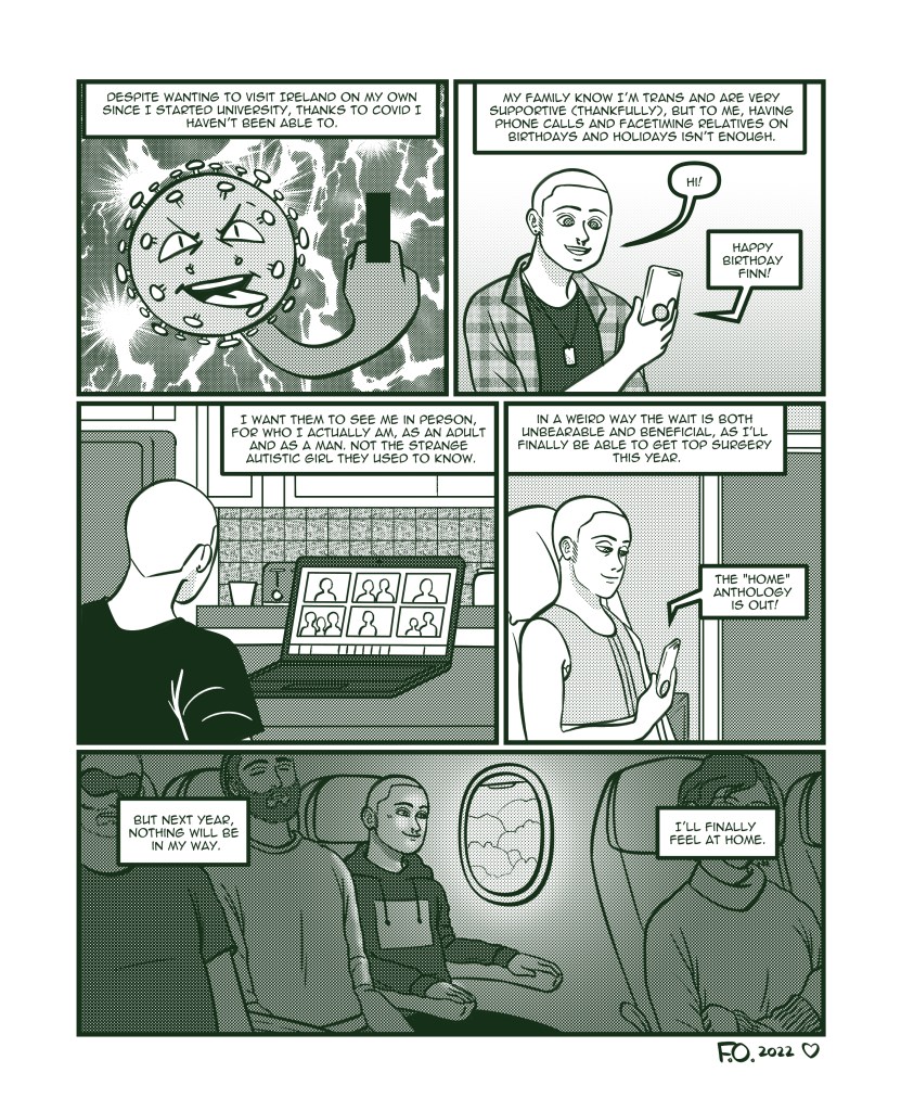 An autobiographical short comic about my relationship to my home country, Ireland, through the lenses of gender, disability, family, and distance. GOING HOME’ was created for the 2022 anthology ‘HOME: A Comics Anthology on Belonging in Ireland Today’, edited by Katherine Foyle and published by the Dublin Comic Arts Festival. ‘HOME’ was nominated for an Ignatz award in the category of ‘Best Anthology’ in 2023.
